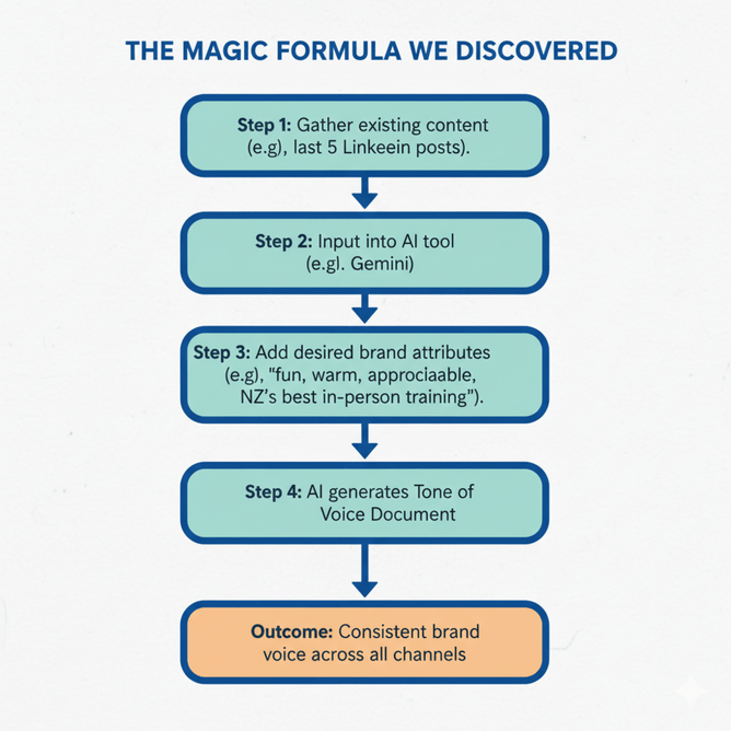 We cut and pasted those posts into Gemini and asked it to create a tone of voice document based on what it could see. But here's the crucial bit: we told Gemini exactly what we wanted to be known for. "We want to be New Zealand's best in-person training provider and be known for being fun, warm, and approachable."