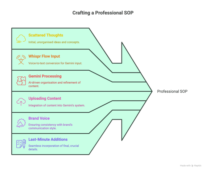 Watching Gemini transform my rambling into a professional, SOP was like watching a master chef turn random ingredients into a gourmet meal (and I love a gourmet meal!!) Suddenly, all those scattered thoughts were organised into clear sections with proper headings, logical flow, and – most importantly – it sounded exactly like us.
